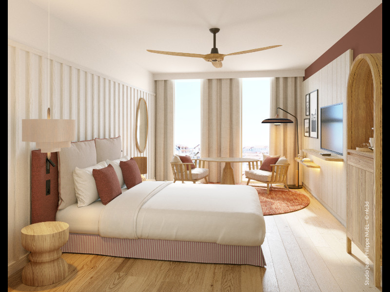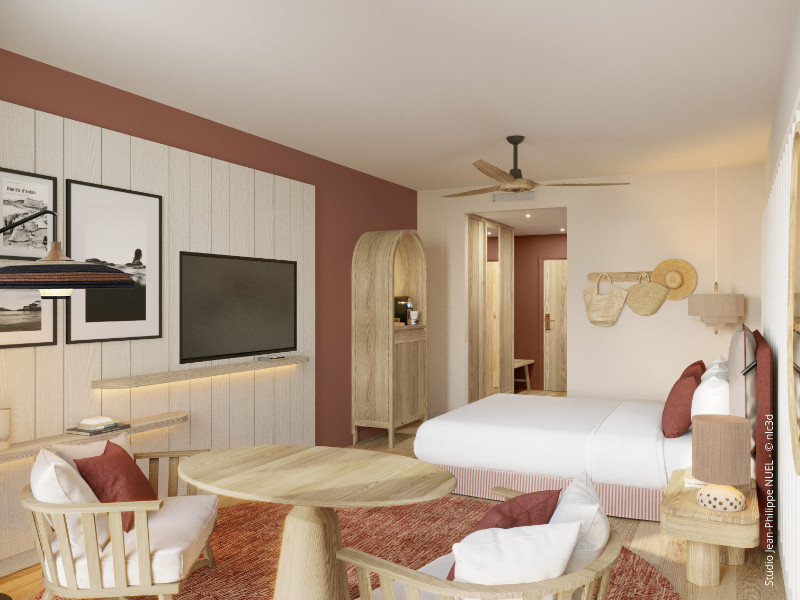 Les 149 chambres et suites invitent à l'inspiration, avec des jeux de matières naturelles et des teintes apaisantes évoquant la douceur de vivre en bord de mer. À travers ses espaces remplis de vie et baignés de lumière, l'architecture contemporaine joue avec les codes néo-basques, les couleurs franches et les matières chaleureuses