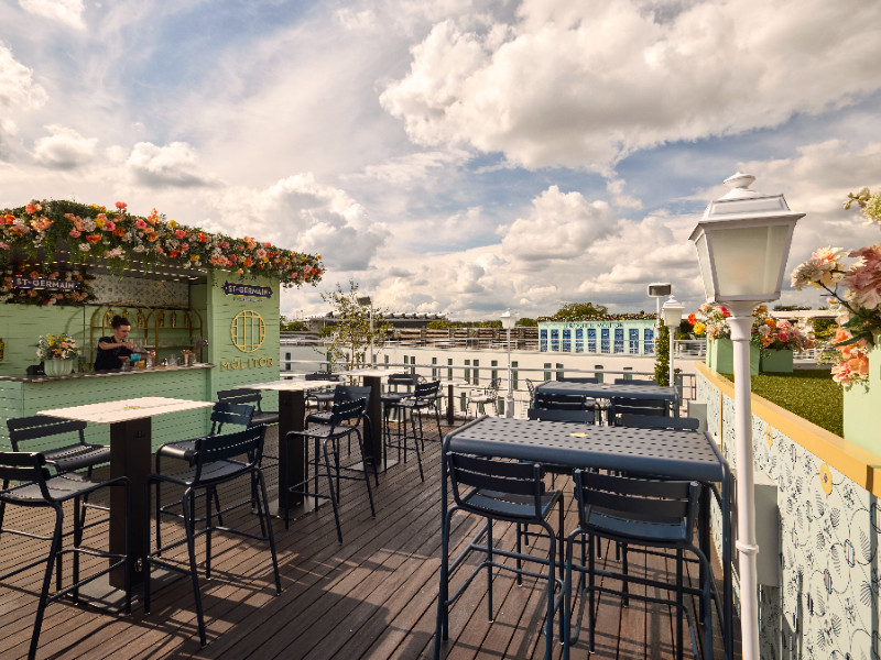 La brasserie molitor et sa coursive extérieure vue Bassin : L’espace se prête à de nombreuses configurations. Le restaurant peut accueillir 80 personnes pour un repas assis et jusqu’à 150 personnes pour un cocktail.