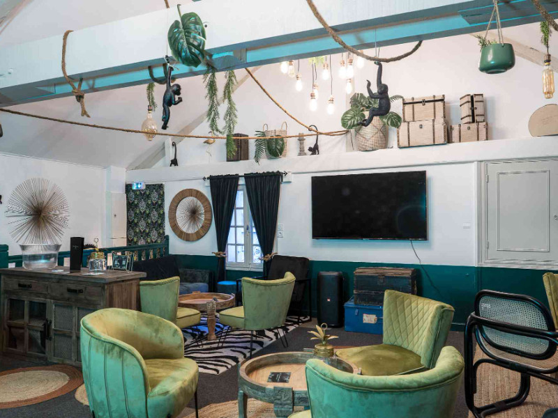 Bar 133 Jungle – Étage : Salle de 50 m² à la décoration jungle élégante et inspirante, accueillant jusqu’à 25 personnes. Parfaite pour comités restreints ou événements confidentiels, avec lumière naturelle, Wi-Fi fibre optique, vidéoprojecteur, paperboard, papier et stylos.