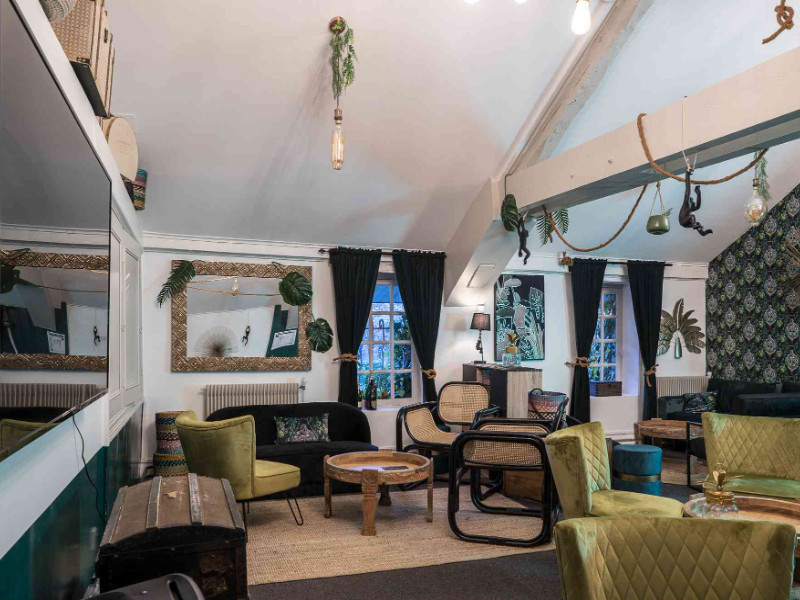 Bar 133 Jungle – RDC : Salle de 50 m² à l’ambiance jungle immersive, baignée de lumière naturelle. Idéale pour réunions informelles, cocktails ou ateliers jusqu’à 25 personnes. Équipements complets : Wi-Fi fibre optique, vidéoprojecteur, paperboard, papier et stylos.